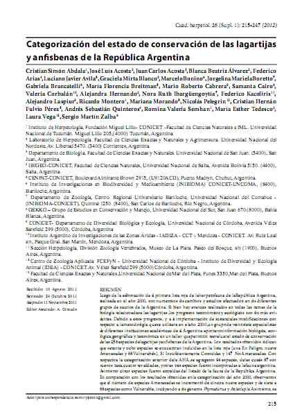 Abdala, Cristian Simón; Acosta, José Luís; Acosta, Juan Carlos; Álvarez, Blanca Beatríz; Arias, Federico; Avila, Luciano Javier; Blanco, Graciela Mirta; Bonino, Marcelo; Boretto, Jorgelina Mariela; Brancatelli, Gabriela; Breitman, María Florencia; Cabrera, Mario Roberto; Cairo, Samanta; Corbalán, Valeria; Hernando, Alejandra; Ibarguengoytía, Nora Ruth; Kacoliris, Federico; Laspiur, Alejandro; Montero, Ricardo; Morando, Mariana; Pelegrín, Nicolás; Pérez, Cristian Hernán Fulvio; Quinteros, Andrés Sebastián; Semhan, Romina Valeria; Tedesco, María Esther; Zalba, Sergio Martín; Vega, Laura. 2012. Categorización del estado de conservación de las lagartijas y anfisbenas de la República Argentina. Cuadernos de Herpetología, vol. 26, N° 3.
