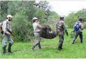 De este modo, Tota volvió a la Ea. Rincón del Socorro después de más de un año de ausencia. La osa fue mantenida en un corral de aclimatación durante unas semanas para colocarle un nuevo arnés transmisor, y finalmente fue liberada de nuevo en el interior de la reserva, justo en un área que suele ser frecuentada por Preto y Arandú, dos machos adultos de la especie. Esperemos que pronto pueda juntarse con uno de éstos para así contribuir al incremento de la población reintroducida de la especie.Finalmente queremos agradecer el apoyo del personal de los campos donde fue encontrada la osa. Ellos evitaron que algunas personas mataran al animal cuando lo vieron por primera vez, nos avisaron de la presencia de la osa, facilitaron la entrada a sus campos e incluso prestaron el apoyo de una carreta para poder sacar al animal de una zona que resultada inaccesible para nuestra camioneta.