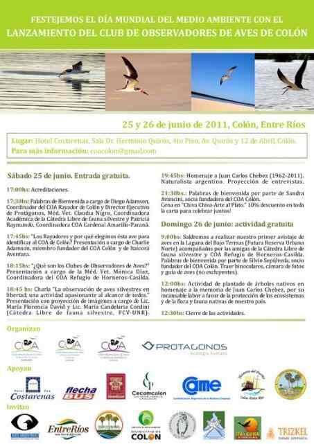 EVENTO DE LANZAMIENTO DEL CLUB DE OBSERVADORES DE AVES DE COLÓN a realizarse el 25 y 26 de junio de 2011, Colón, Entre Ríos.